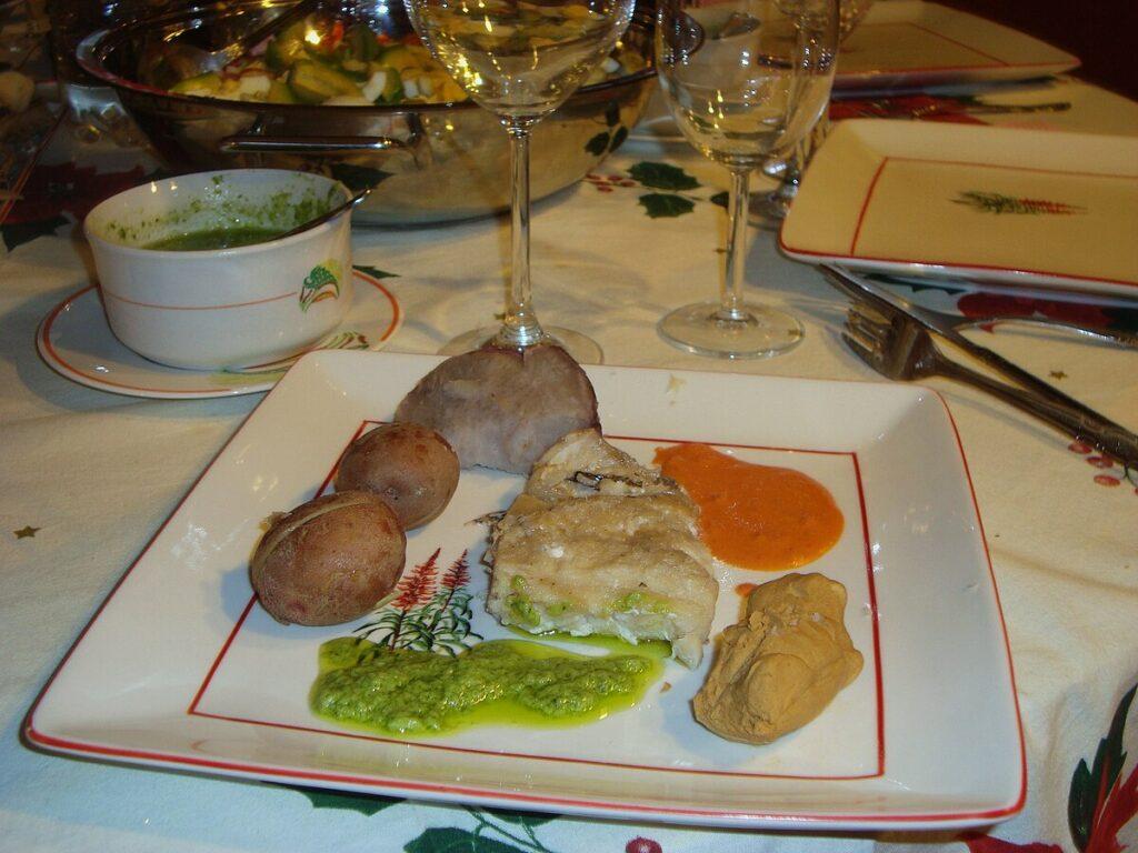 Los ingredientes principales son el pescado salado, papas y batatas.