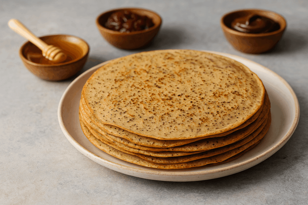 Coloca las tortitas apiladas en un plato amplio, deja que el vapor suave las mantenga tiernas, y acompaña con pequeños cuencos de diferentes acompañamientos para que cada comensal elija su forma de disfrutarlas.